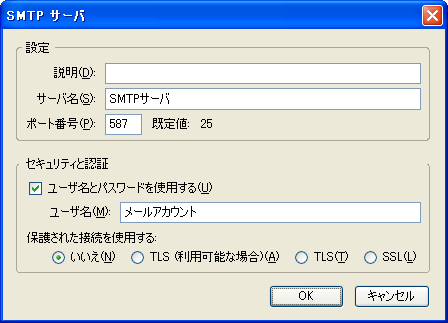 [SMTPサーバ]画面が表示されますので、[設定]項目の[ポート番号]の値を"587"に変更します。[セキュリティと認証]項目の[ユーザ名とパスワードを使用する]にチェックを入れて、[ユーザ名]にお客様のメールアカウントを入力します。